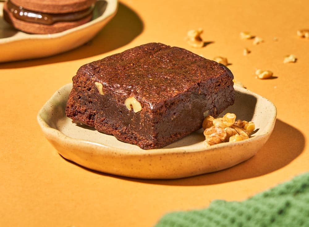 Elaborado con harina de arroz ecológica, cacao en polvo sin azúcar, crema de cacahuete, azúcar de coco, y nueces.