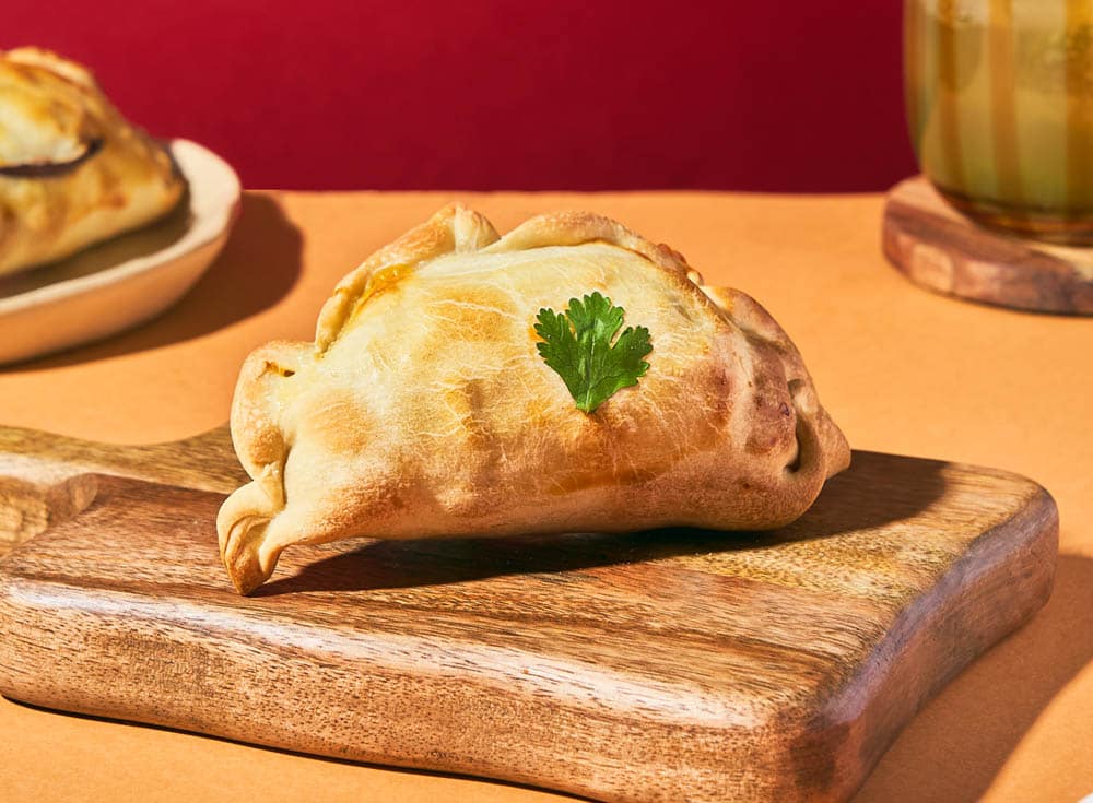 Un viaje directo al corazón de la cocina mexicana. Nuestra empanadilla de taco al pastor está elaborada artesanalmente con carne de cerdo cortada a cuchillo y marinada en una cuidada mezcla de chiles y achiote, que le aportan su característico color y profundidad de sabor. La dulzura natural de la piña se funde con el frescor del cilantro y el toque vibrante de la salsa verde, creando una combinación tan auténtica como irresistible.