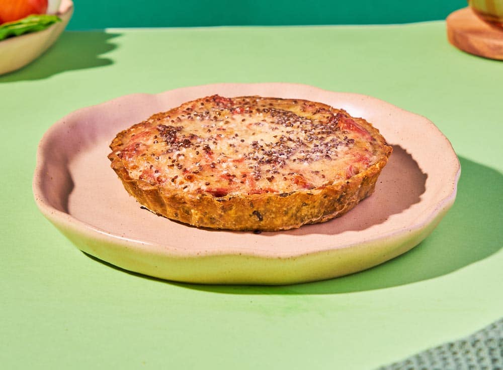El relleno mezcla una variedad de quesos veganos con cebolla y bacon vegano, enriquecido con semillas de chía que aportan un toque crujiente y nutritivo. Todo sobre una masa quebrada de harina ecológica con espinacas, ligera, crujiente y naturalmente sabrosa, que hace de cada bocado una experiencia completa.