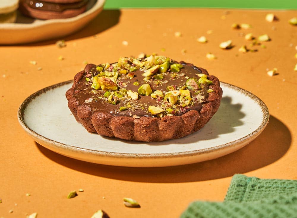 tartaleta de ganaché de chocolate con pistacho y frambuesa